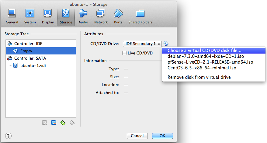 When you start a VM for the first time, VirtualBox will automatically prompt you for a CD-ROM image. However you are going to do it the manual way so that you learn your way around the settings.