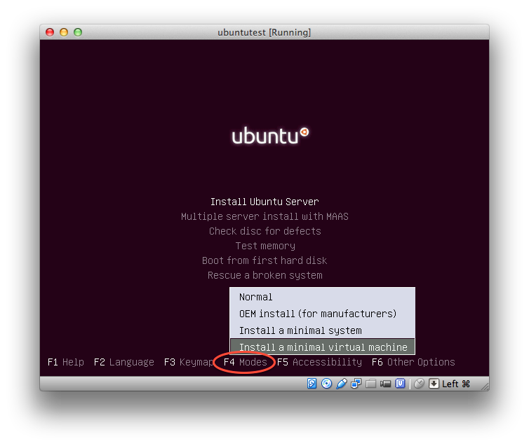 The Ubuntu installer should start. Click inside the window. Note that you have to press the host key to get your mouse out again.