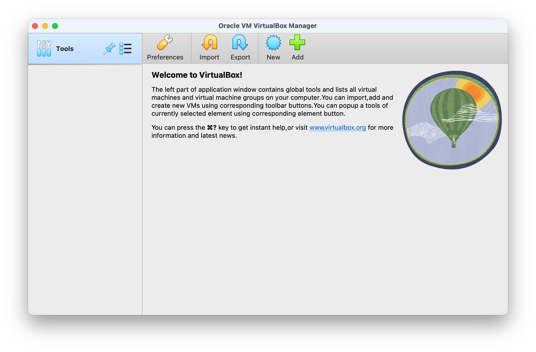 In the VirtualBox Manager window, click on the "New" button (a blue spiky circle)